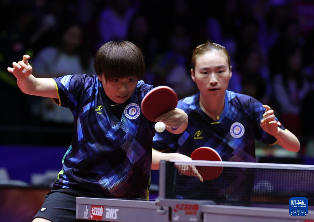 6月11日,华东理工大学队组合张翔宇(左)/王晓彤在比赛中。她们在双打比赛中0比3不敌深圳大学队组合蒯曼/平野美宇。