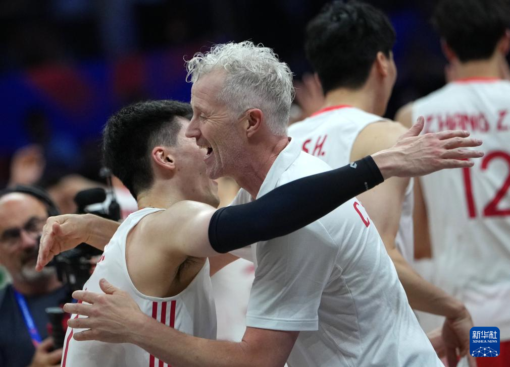6月12日,中国队主教练维塔尔·海宁(右)在比赛后与球员于垚辰拥抱庆祝。