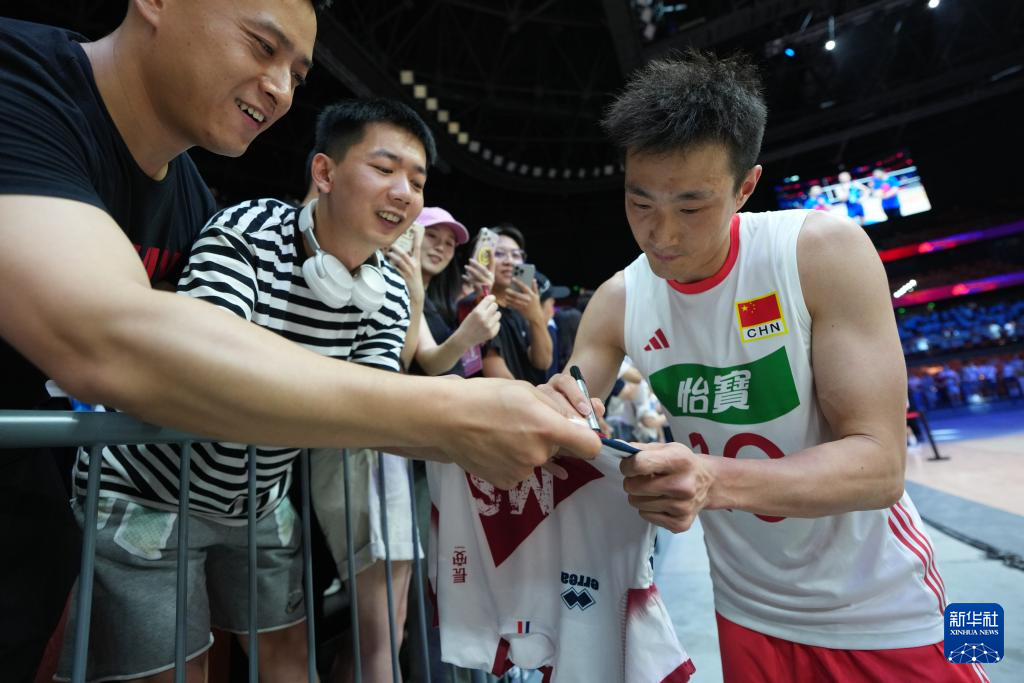 6月12日,中国队球员季道帅(右)在比赛后为球迷签名。