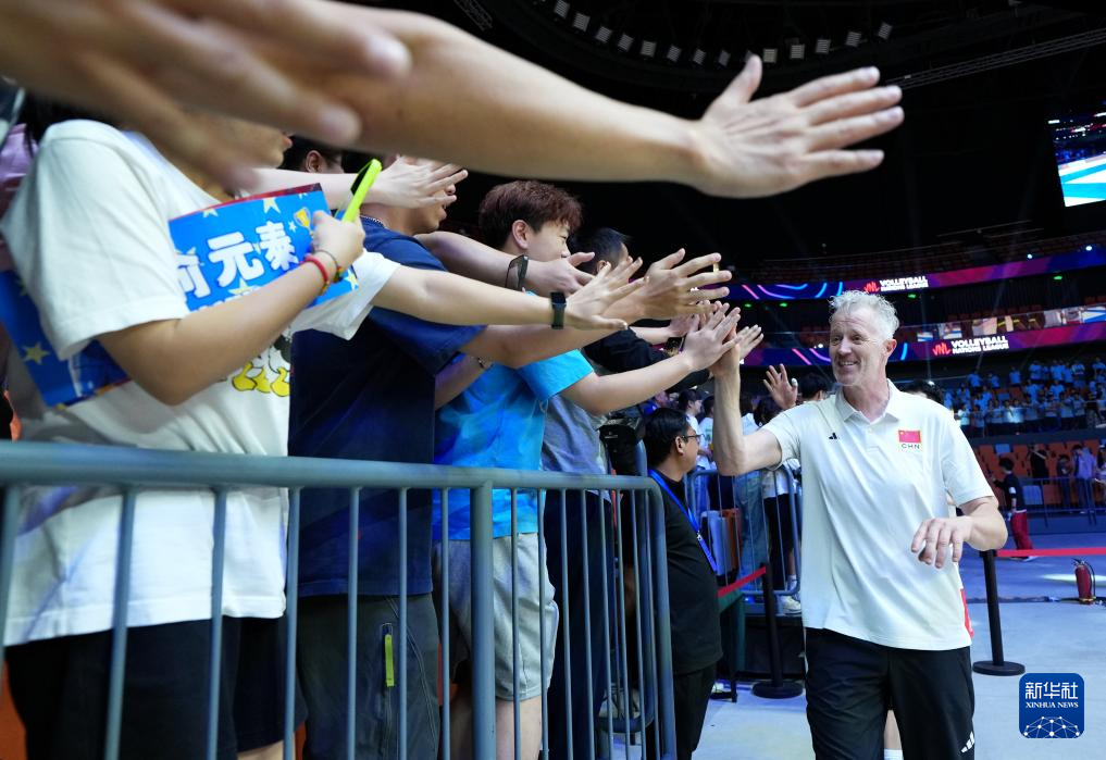 6月12日,中国队主教练维塔尔·海宁(右)在比赛后与球迷击掌。