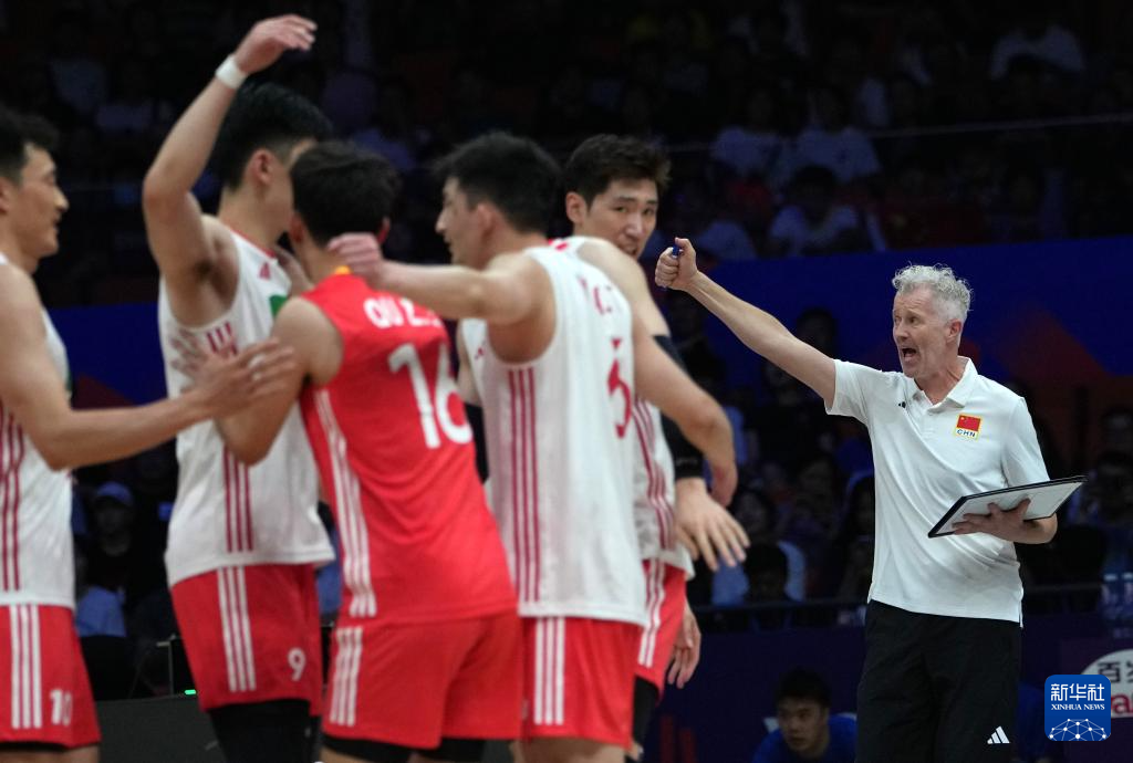 6月12日,中国队主教练维塔尔·海宁(右一)在比赛中庆祝得分。