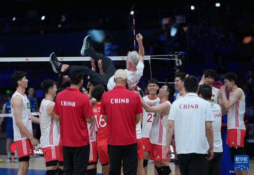 6月12日,中国队球员在比赛后抛起主教练维塔尔·海宁(上)庆祝。