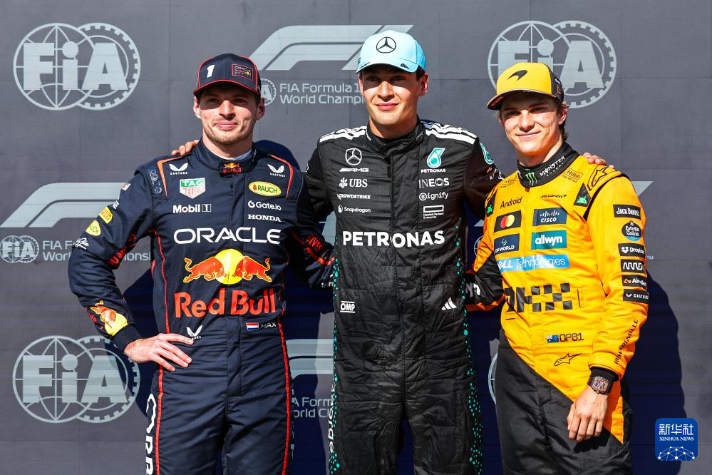 6月14日,获得杆位的梅赛德斯车队英国车手拉塞尔(中)、第二名红牛车队荷兰车手维斯塔潘(左)、第三名迈凯伦车队澳大利亚车手皮亚斯特里在比赛后合影。