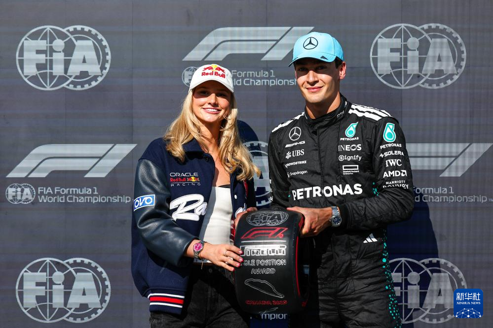 6月14日,巴黎奥运会冠军、加拿大游泳运动员麦金托什(左)为获得杆位的梅赛德斯车队英国车手拉塞尔颁发杆位奖。