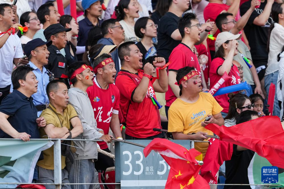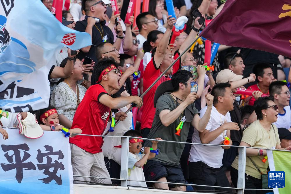 6月14日,淮安队球迷在场边为球员加油。