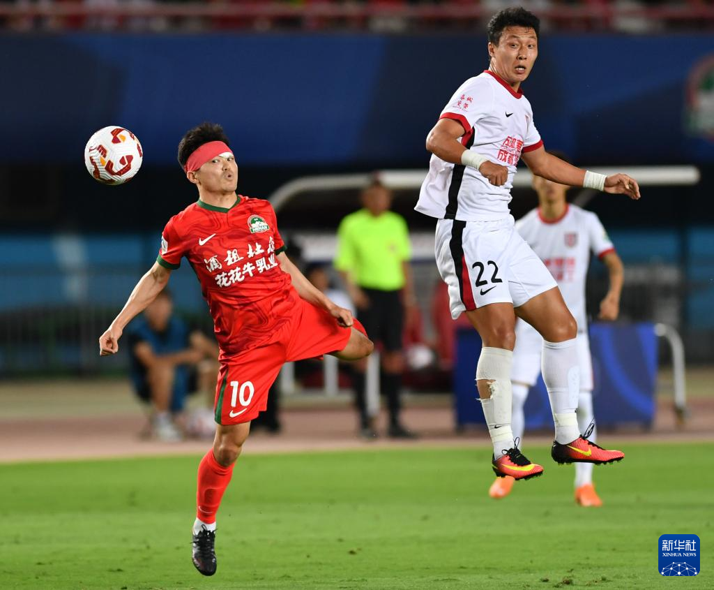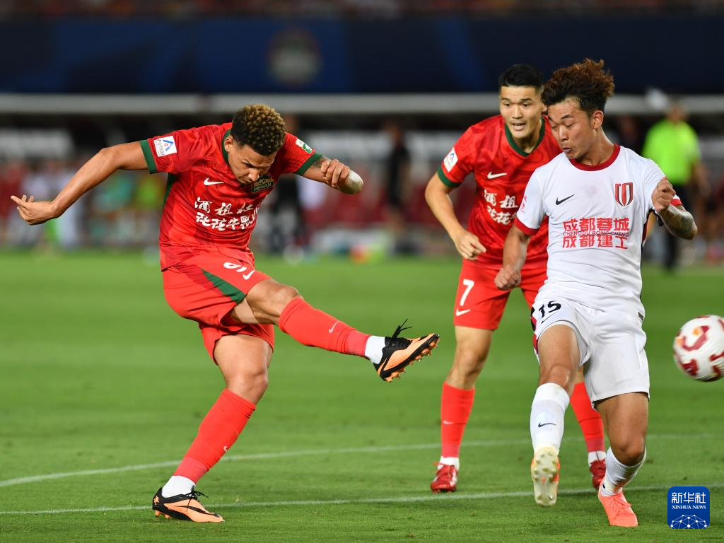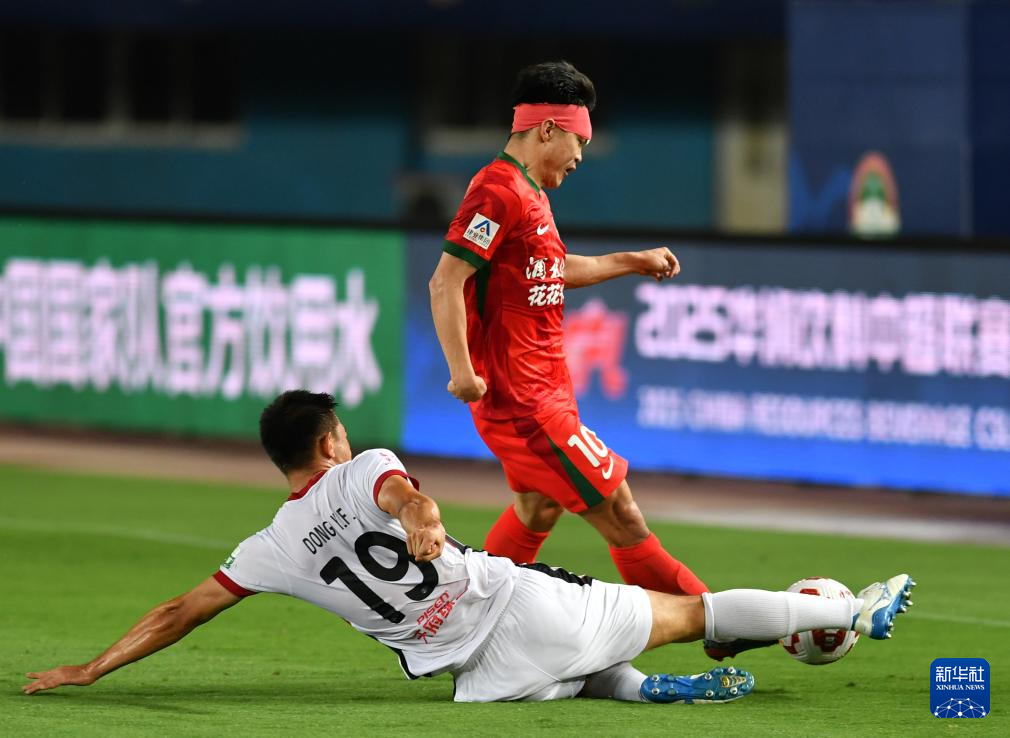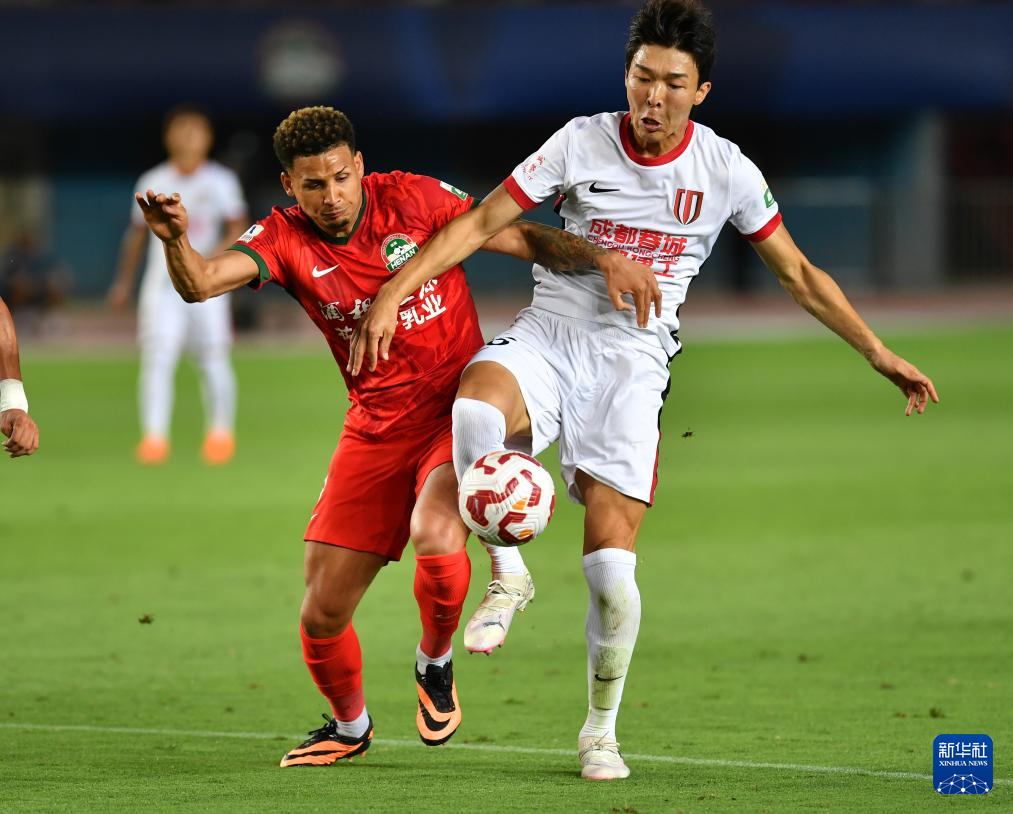 6月14日,河南俱乐部酒祖杜康队球员费利佩·卡多索(左)与成都蓉城队球员元敏诚在比赛中拼抢。