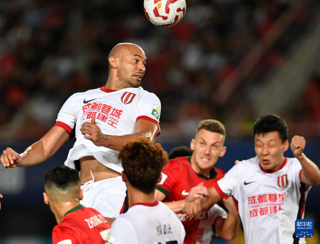 6月14日,成都蓉城队球员费利佩(上)在比赛中争抢头球。