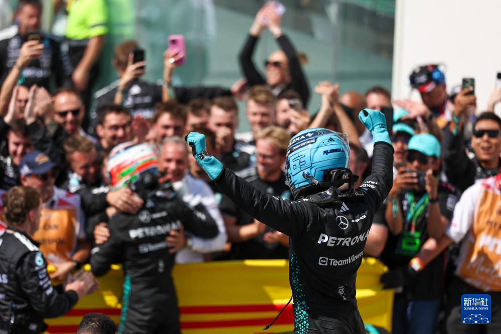 6月15日,梅赛德斯车队英国车手拉塞尔夺冠后庆祝。