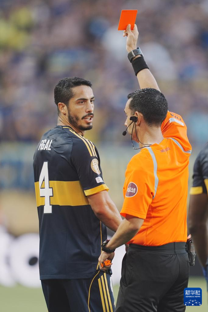 6月16日,主裁判拉莫斯(右)向博卡青年队球员菲加尔出示红牌。