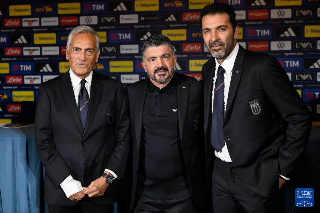 6月19日,意大利足协主席格拉维纳、意大利男足新任主教练加图索和意大利前国家队守门员布冯(从右至左)在新闻发布会后合影。新华社发(阿尔贝托·林格利亚摄)