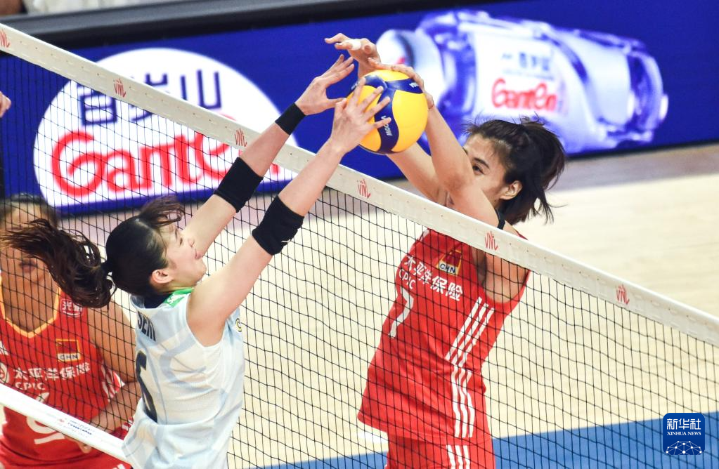 6月21日,中国队球员庄宇珊(右二)在比赛中拦网。