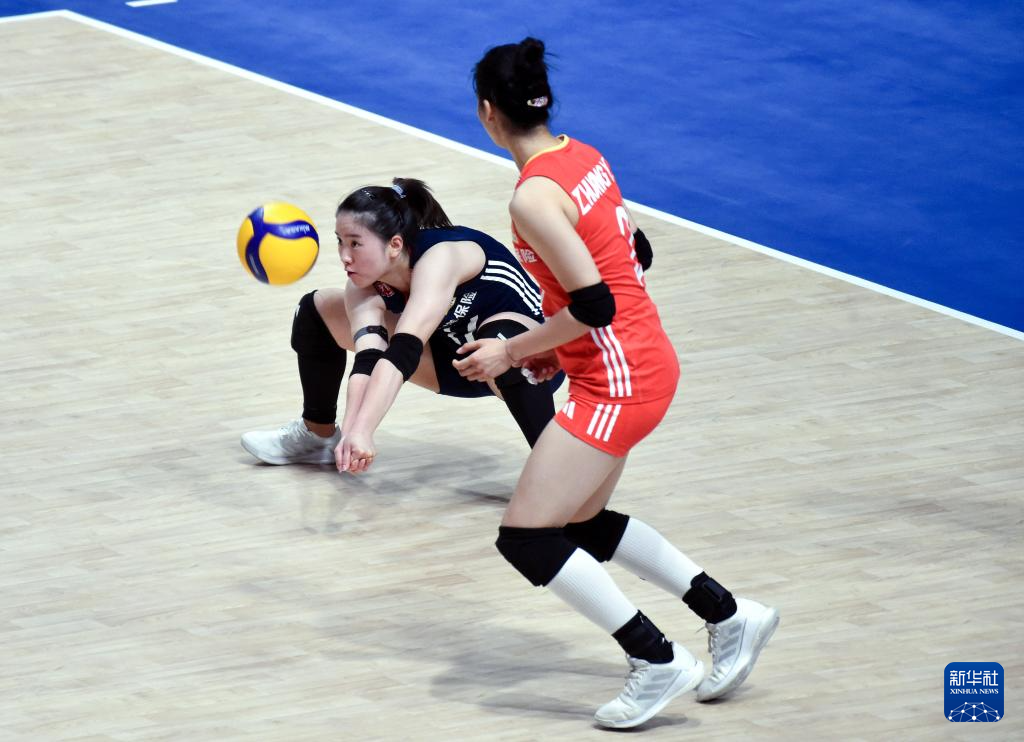6月21日,中国队球员倪非凡(左)在比赛中垫球。