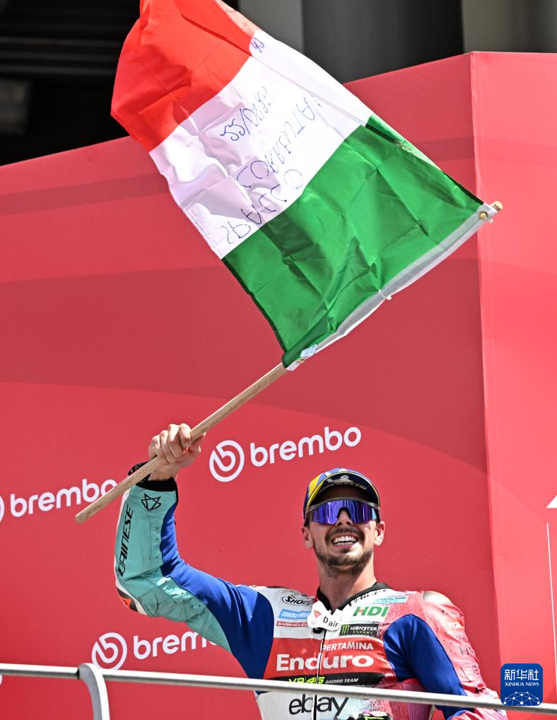 6月22日,季军VR46车队意大利车手詹南托尼奥在领奖台上庆祝。新华社发