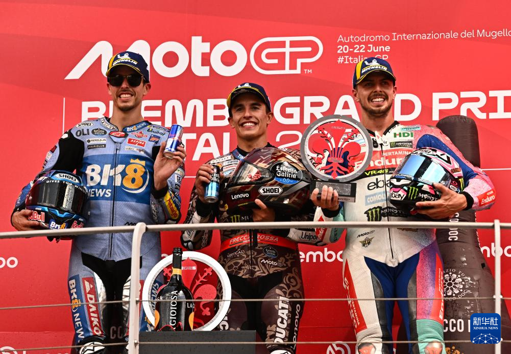 6月22日,获得MotoGP组前三名的杜卡迪-联想车队车手马克·马克斯(中)、BK8格雷西尼车队车手阿莱克斯·马克斯(左)与VR46车队意大利车手詹南托尼奥在领奖台上。新华社发