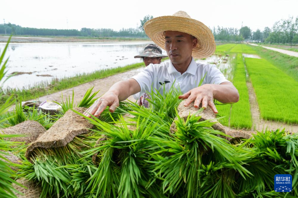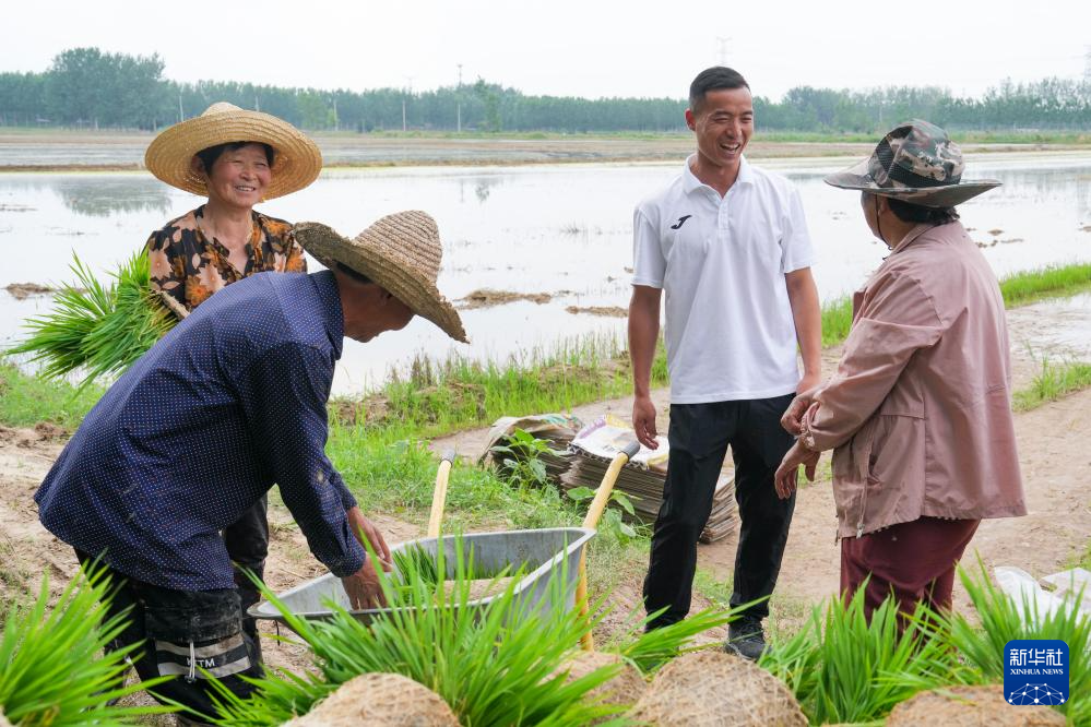 6月23日,戴虎(前)帮助村民搬运水稻秧苗。新华社记者 李博 摄