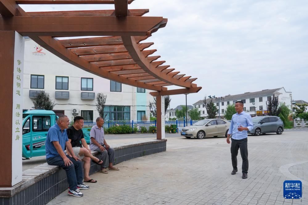 6月23日,戴虎(右一)与韩陈村与村民们讨论“苏超”赛况。新华社记者 李博 摄