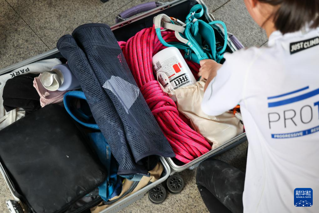 在结束半天的训练后,何芊芊自己整理好装满攀岩装备的行李箱,准备返回香港(6月21日摄)。新华社记者 梁旭 摄
