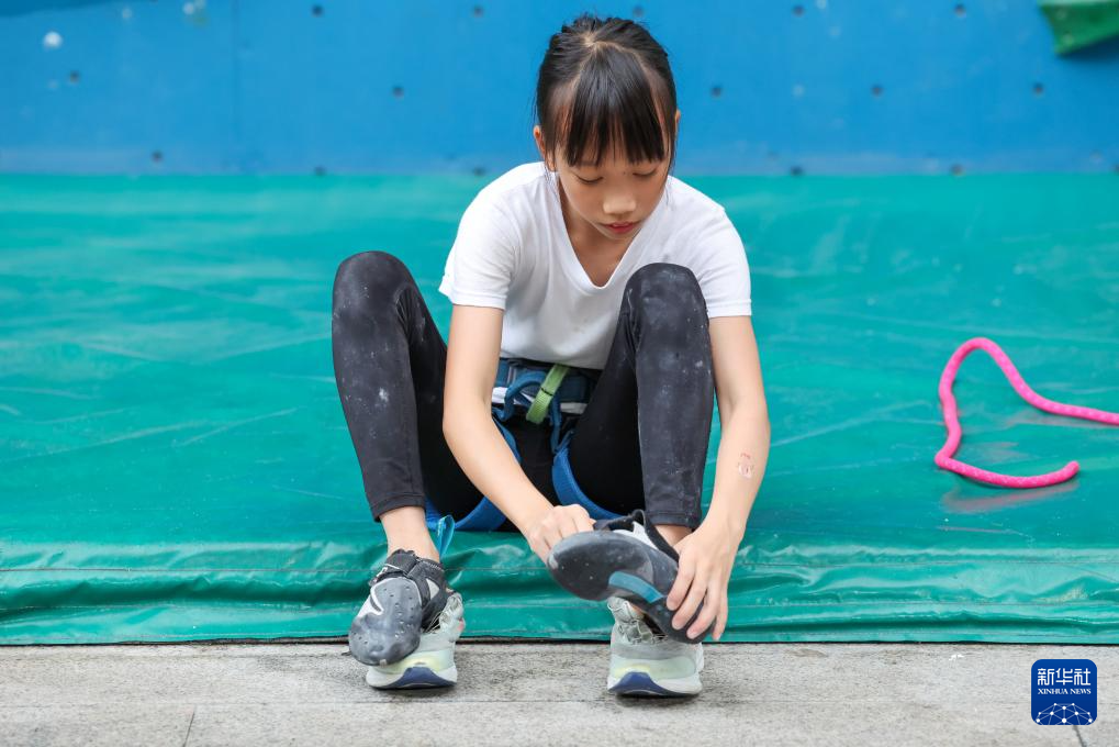 在深圳福田区呢度有家攀岩馆,何芊芊在难度攀岩训练开始前穿攀岩鞋(6月17日摄)。新华社记者 梁旭 摄