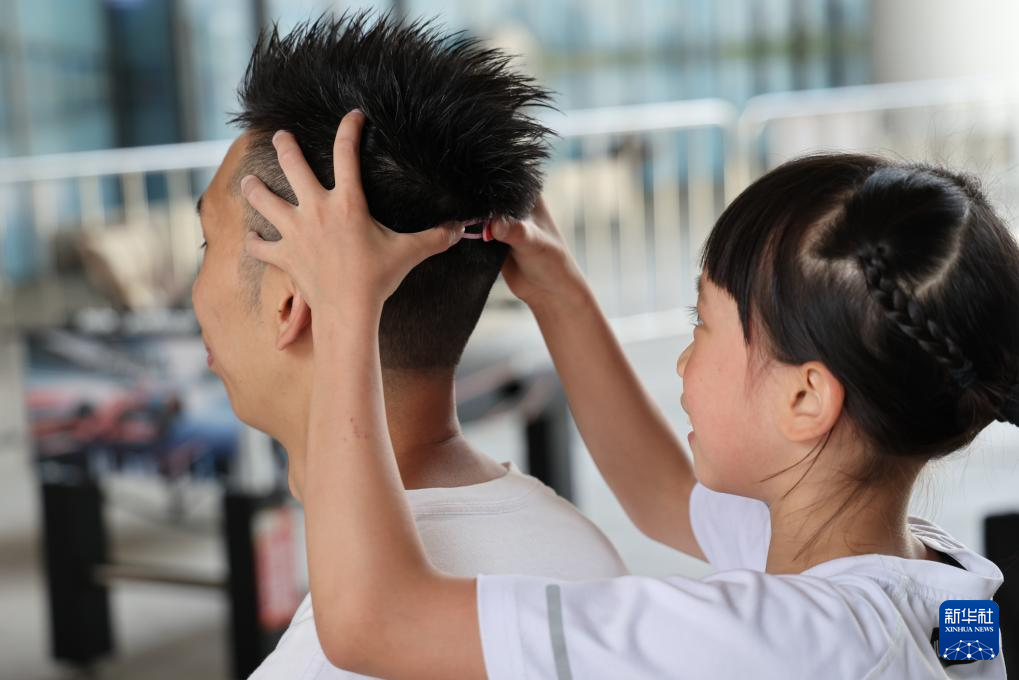 在结束训练后,何芊芊把自己的发卡别在爸爸头上(6月21日摄)。新华社记者 梁旭 摄