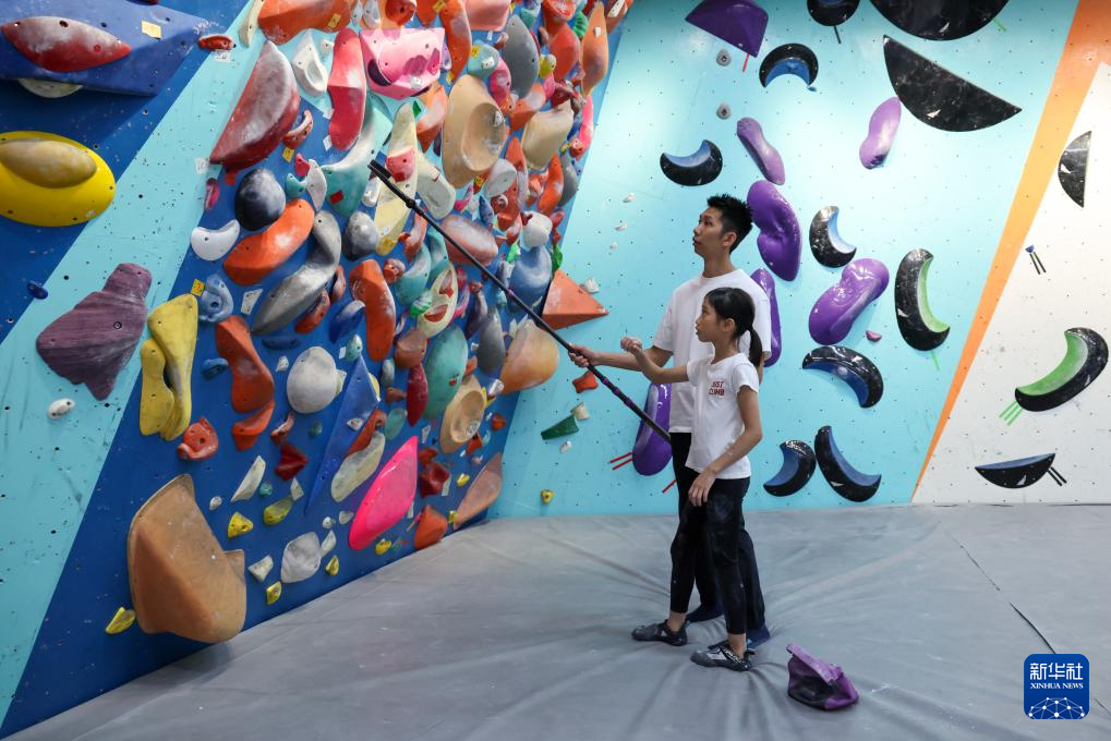 在深圳福田区呢度有家攀岩馆,何芊芊(右)在爸爸何善挥的保护下开始难度攀岩训练(6月17日摄)。新华社记者 梁旭 摄