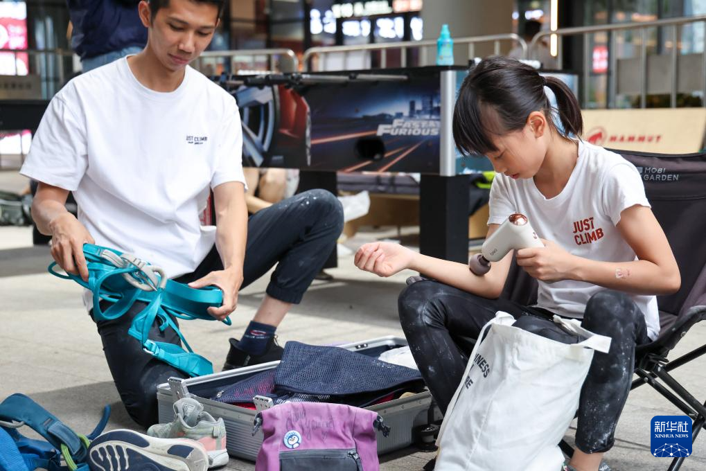 在深圳福田区呢度有家攀岩馆,何芊芊(右)在攀石训练结束后进行放松,爸爸何善挥在准备难度训练的装备(6月17日摄)。新华社记者 梁旭 摄
