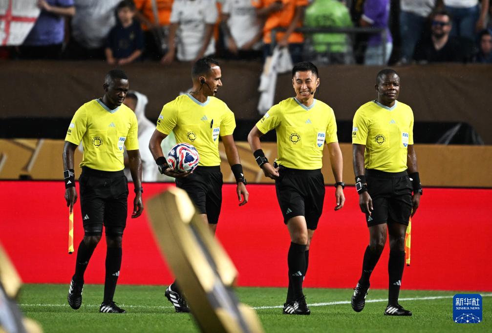 6月26日,主裁判贝达(左二)、第四官员马宁(右二)等裁判入场。