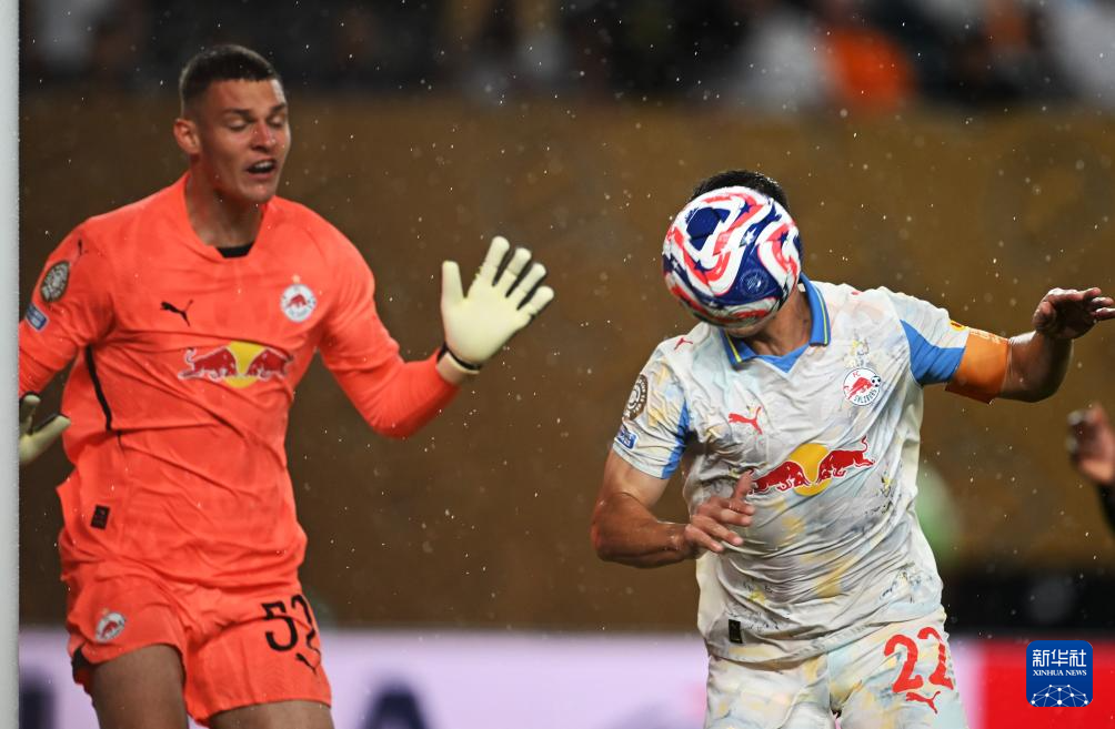 6月26日,萨尔茨堡队球员拉特科夫(左)在比赛中争顶。