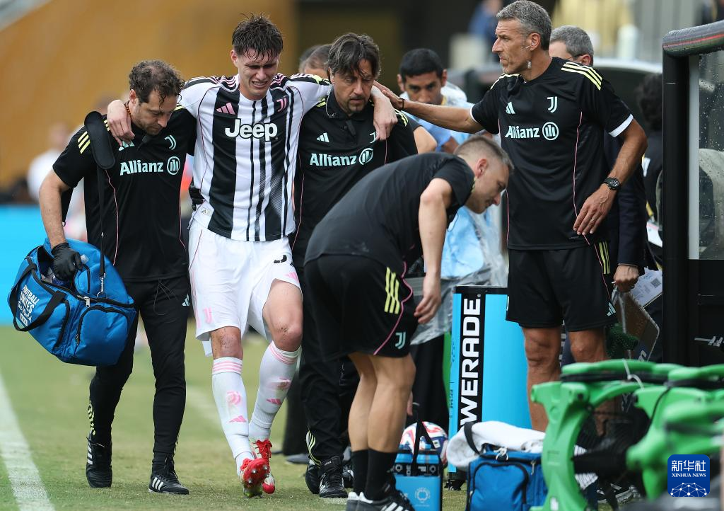6月26日,尤文图斯队球员萨沃纳(左二)受伤后被搀扶下场。