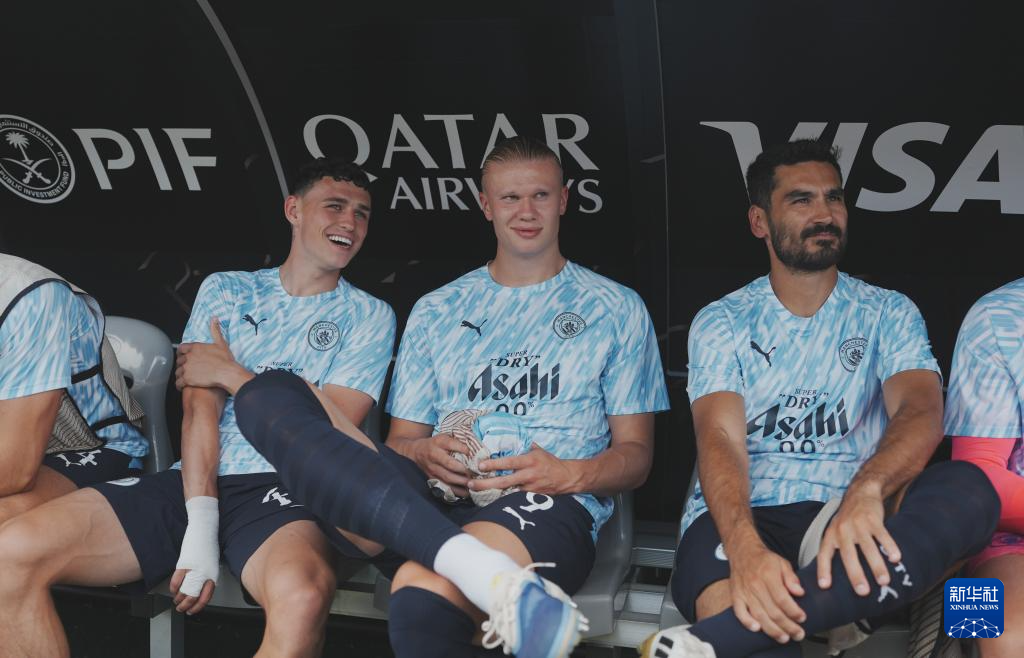 6月26日,曼城队球员福登、哈兰德、京多安(从左至右)在比赛前。