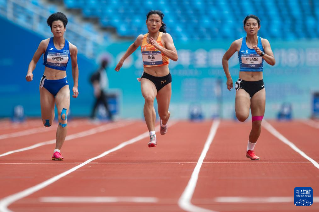 6月28日,重庆队选手陈名(中)在女子少年U18组100米预赛中。最终,她以12秒25的成绩晋级半决赛。