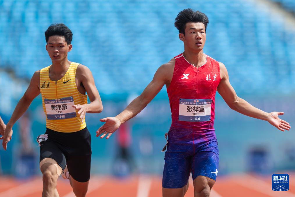 6月28日,北京队选手张梓宣(右)在男子少年U18组100米预赛冲线后。最终,他以10秒68的成绩晋级半决赛。