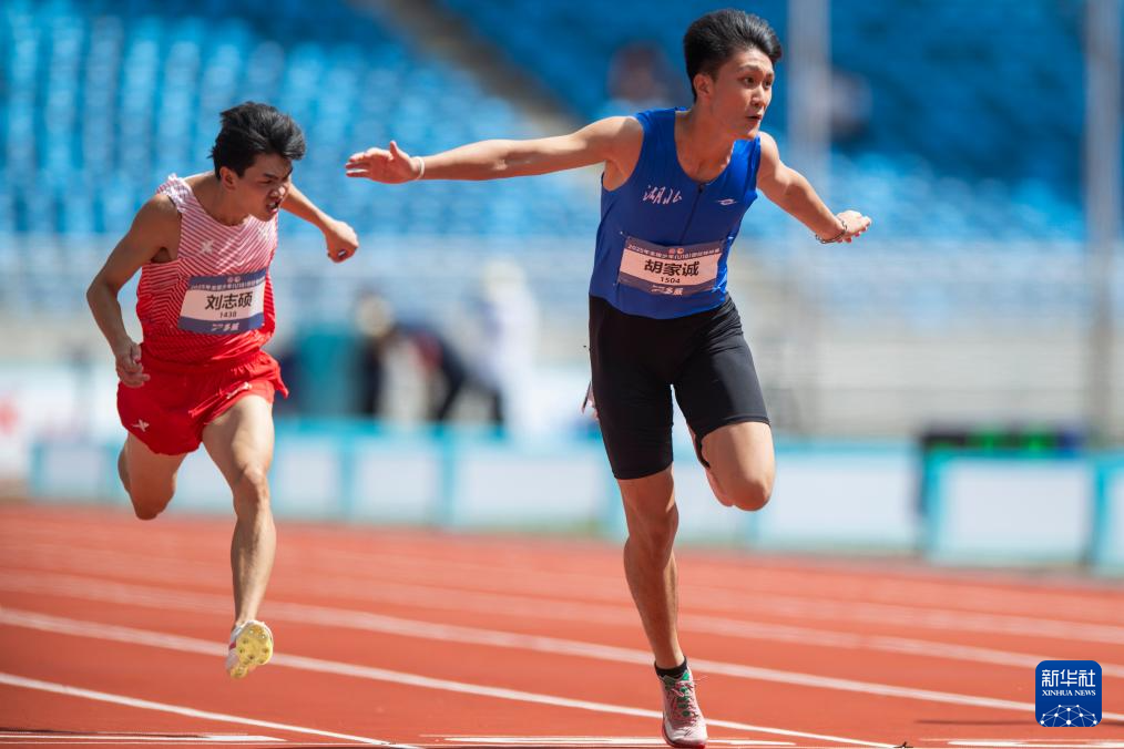 6月28日,湖北弹射者队选手胡家诚(右)在男子少年U18组100米预赛中冲线。最终,他无缘半决赛。