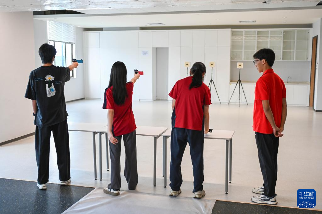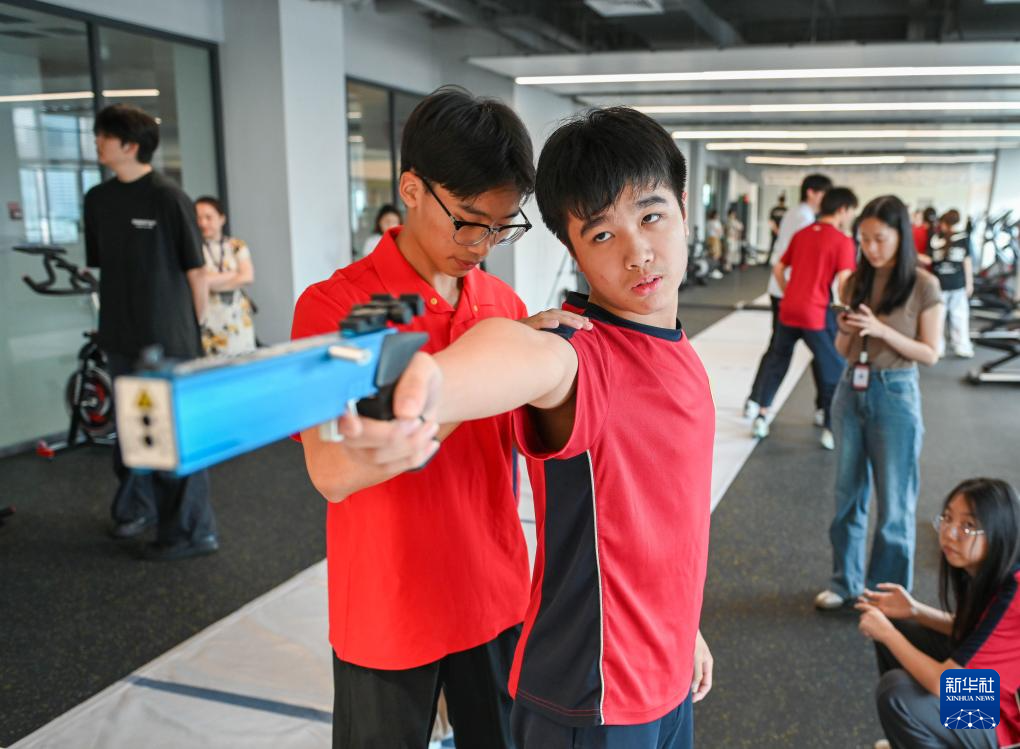 图为学生们在广州市中黄港澳子弟学校运动室进行射击训练(6月19日摄)。新华社记者 肖恩楠 摄