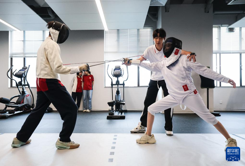 图为广东现代五项运动协会教练员肖勇炫(右)纠正广州市中黄港澳子弟学校港籍生张嗣涛击剑技术细节(6月19日摄)。新华社记者 刘大伟 摄