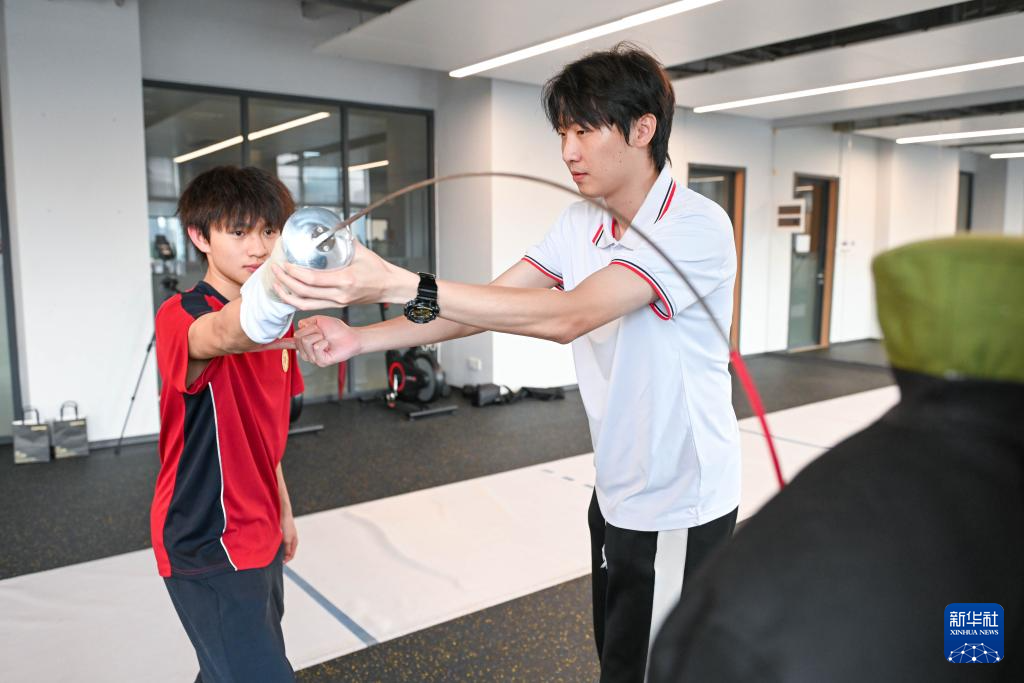 图为广东现代五项运动协会教练员肖勇炫(右)纠正广州市中黄港澳子弟学校港籍生张嗣涛击剑技术细节(6月19日摄)。新华社记者 肖恩楠 摄