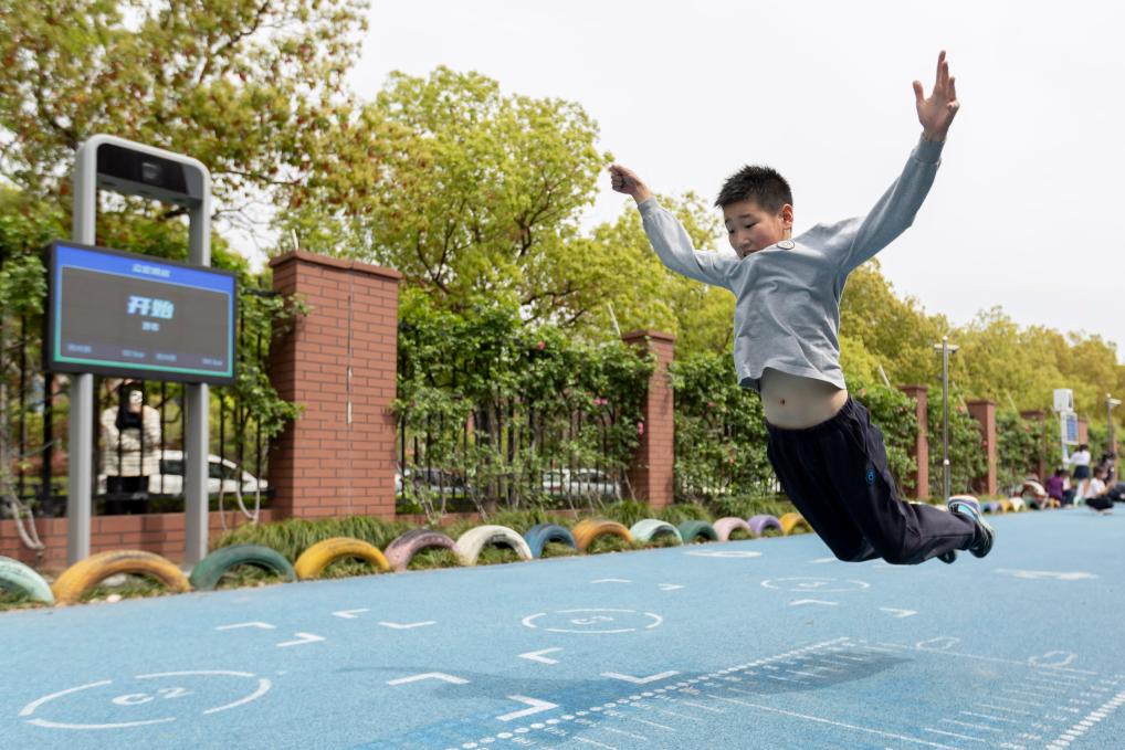 4月11日,在上海师范大学附属闵行第三小学,学生在体育课体验AI跳远测试,智能设备能在学生跳远后展示成绩。新华社记者 王翔 摄