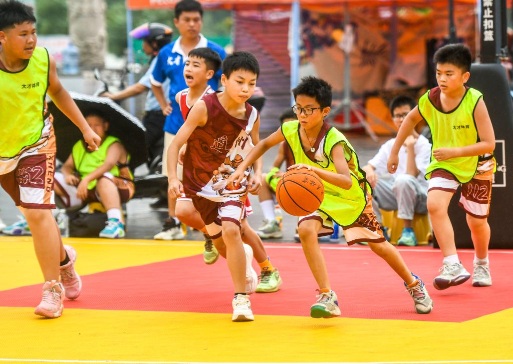 6月1日,在湖南省永州市道县周敦颐广场,孩子们在打篮球。新华社发(蒋克青摄)