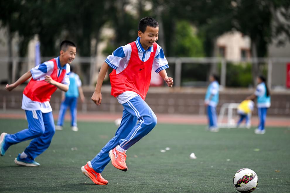 6月25日,中学生们在活动中参加校园足球课。新华社记者 连振 摄