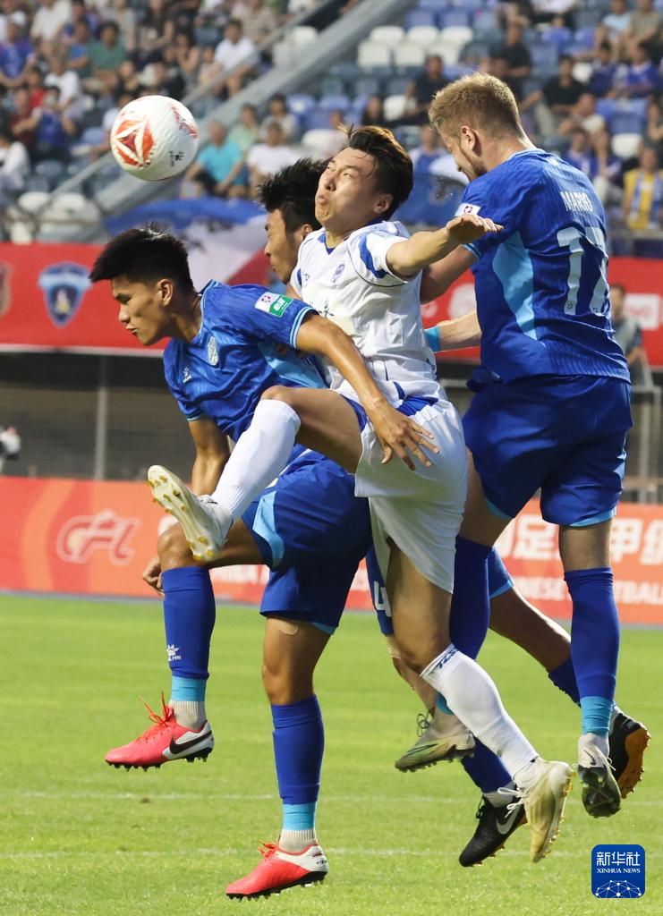6月29日,石家庄功夫队球员王靖斌(中)与佛山南狮队球员马里奥(右一)在比赛中争顶。新华社发(梁子栋摄)