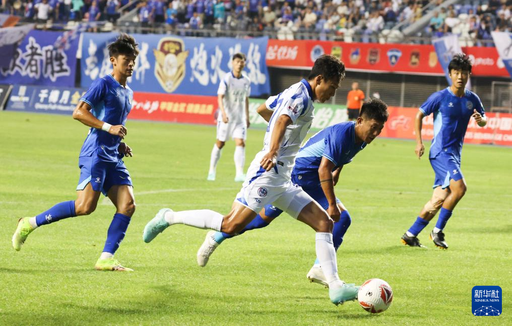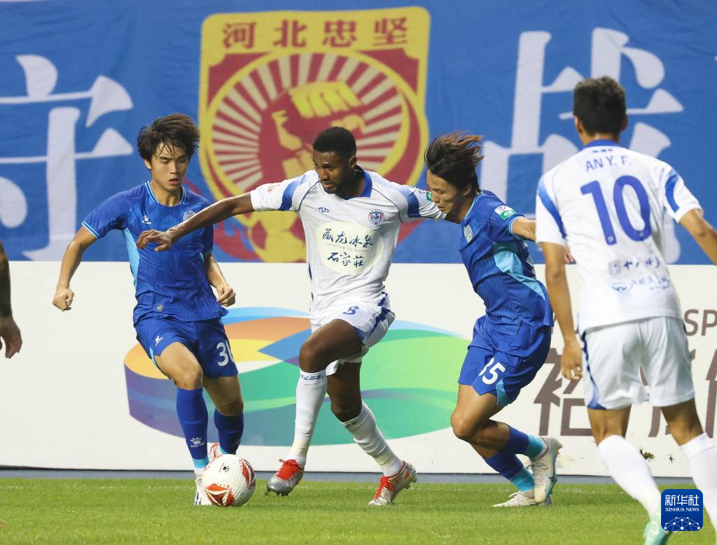 6月29日,石家庄功夫队球员安屹斐(左三)在比赛中带球进攻。新华社发(梁子栋摄)
