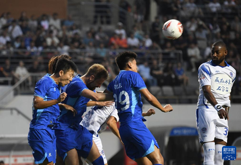 6月29日,石家庄功夫队球员丹克莱尔(左二)在比赛中头球进攻。新华社发(梁子栋摄)