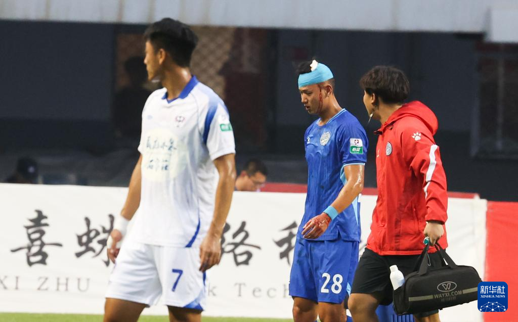 6月29日,佛山南狮队球员张智豪(中)在比赛中受伤离场。新华社发(梁子栋摄)