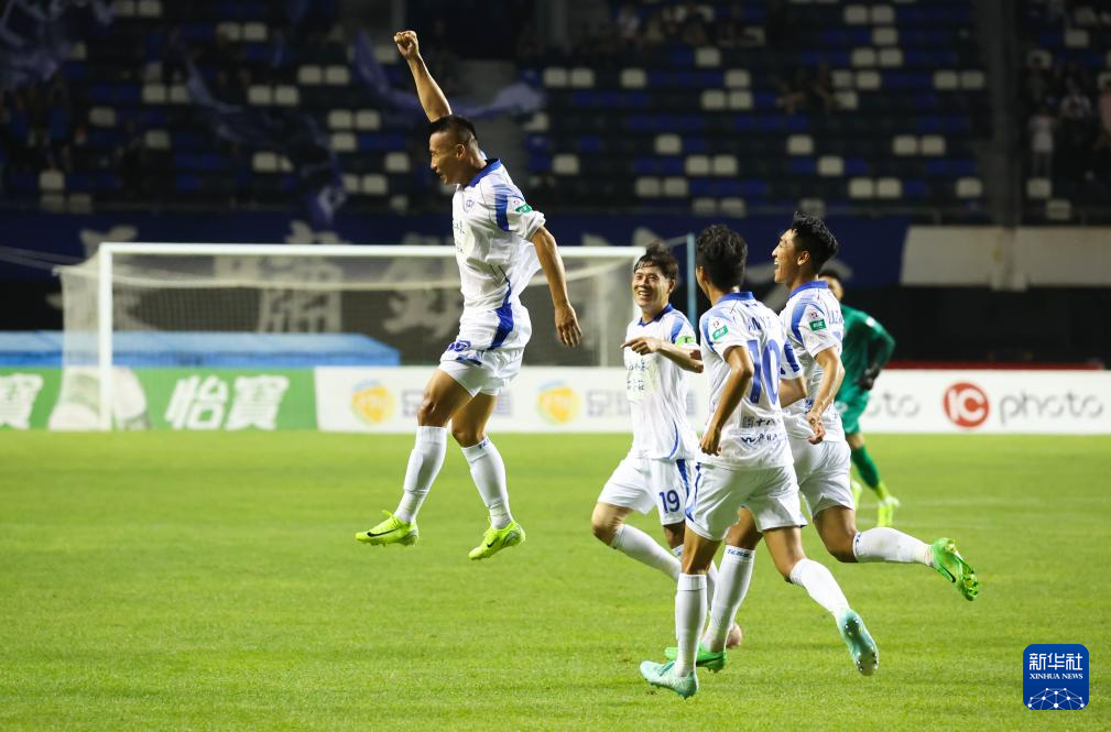 6月29日,石家庄功夫队球员杨云(左一)在比赛中庆祝进球。新华社发(梁子栋摄)