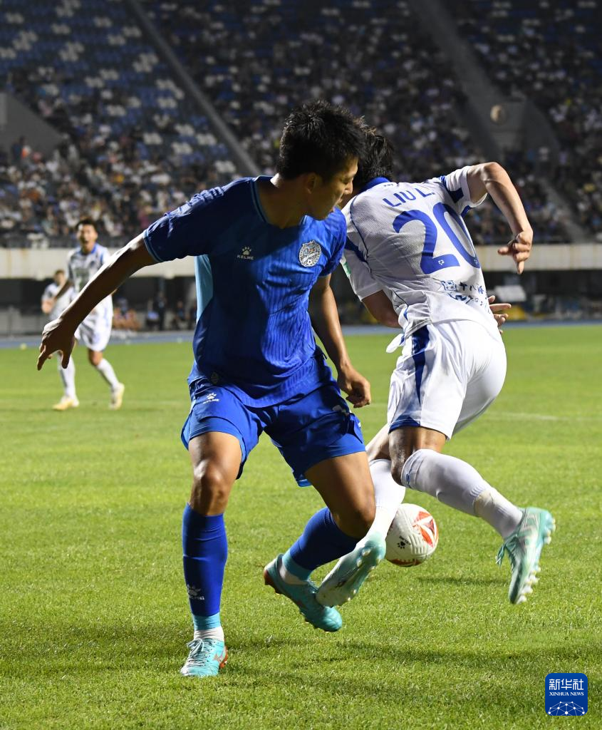 6月29日,石家庄功夫队球员杨云(左)在比赛中带球进攻。新华社发(梁子栋摄)
