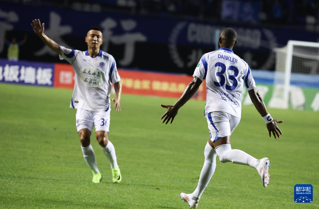6月29日,石家庄功夫队球员丹克莱尔(右)与队友庆祝进球。新华社发(梁子栋摄)