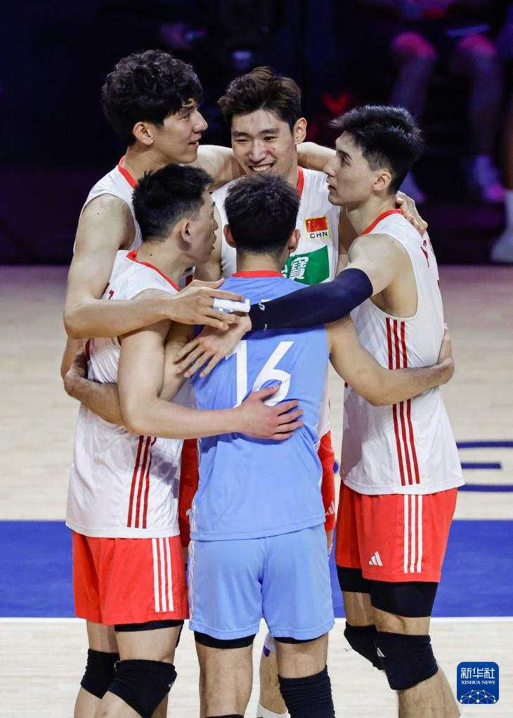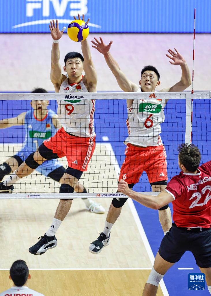 6月29日,中国队球员李咏臻(中)在比赛中扣球。新华社发(乔尔·莱纳摄)