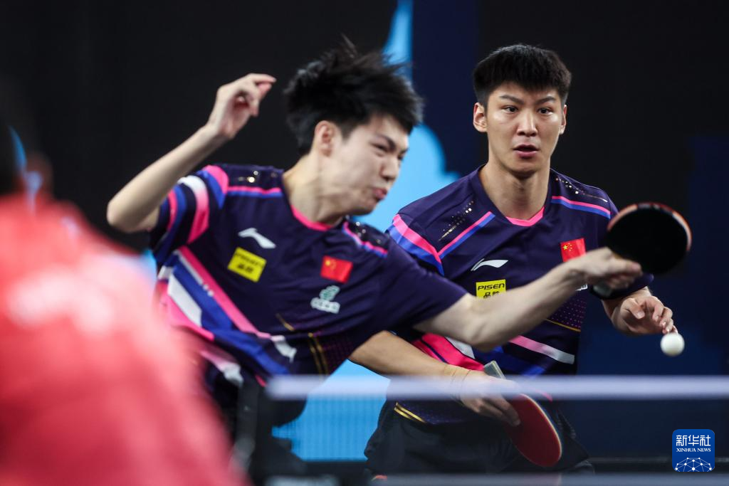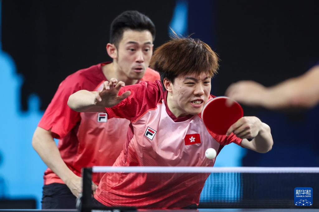 6月29日,中国香港组合黄镇廷/陈颢桦(前)在男子双打决赛中。最终,他们3比2战胜中国组合黄友政/薛飞,获得冠军。新华社发(伊戈尔·克拉利摄)