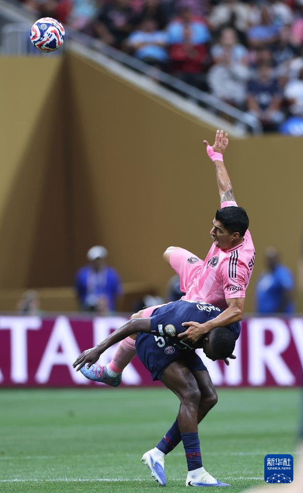 6月29日,迈阿密国际队球员苏亚雷斯(上)与巴黎圣日耳曼队球员帕乔在比赛中拼抢。新华社记者 李明 摄