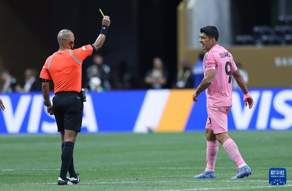 6月29日,迈阿密国际队球员苏亚雷斯(右)被主裁判出示黄牌。新华社记者 李明 摄