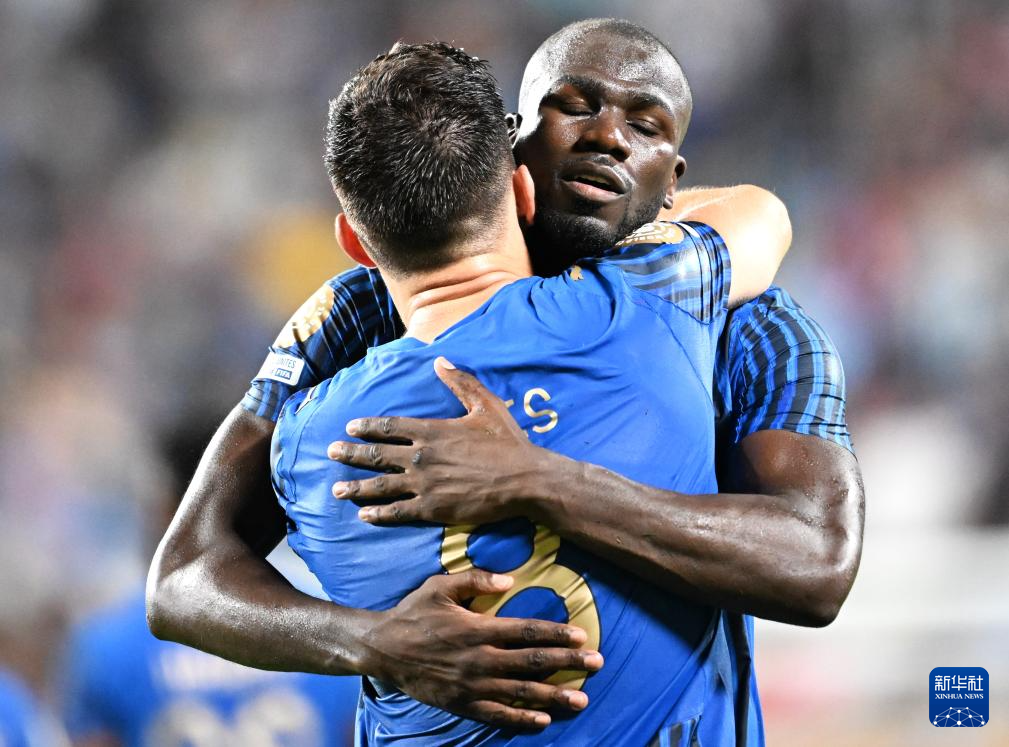 6月30日,利雅得新月队球员库利巴利(右)进球后和队友庆祝。新华社记者 吴晓凌 摄